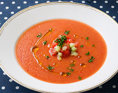 アンダルシア地方の強い日差しが生んだ、伝統的な冷製スープです。完熟トマトをベースに、きゅうり、パプリカ、にんにく、そして上質なオリーブオイルを贅沢に使用。野菜の滋味をそのままに、シェリーヴィネガーの爽やかな酸味が食欲を呼び覚まします。