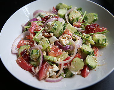 ギリシャのグリークサラダにとてもよく似ています。ブータンではヤクのチーズを散らしますが、日本では手に入らないため、フェタなどで代用します