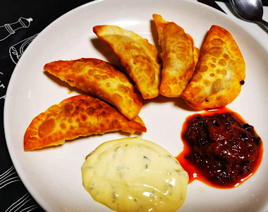 伝統的なエンパナーダを小さくアレンジし、辛味をプラスしたスペインの塩系のおやつ。スパイシーなソースがアクセントとなり、食欲をそそります。